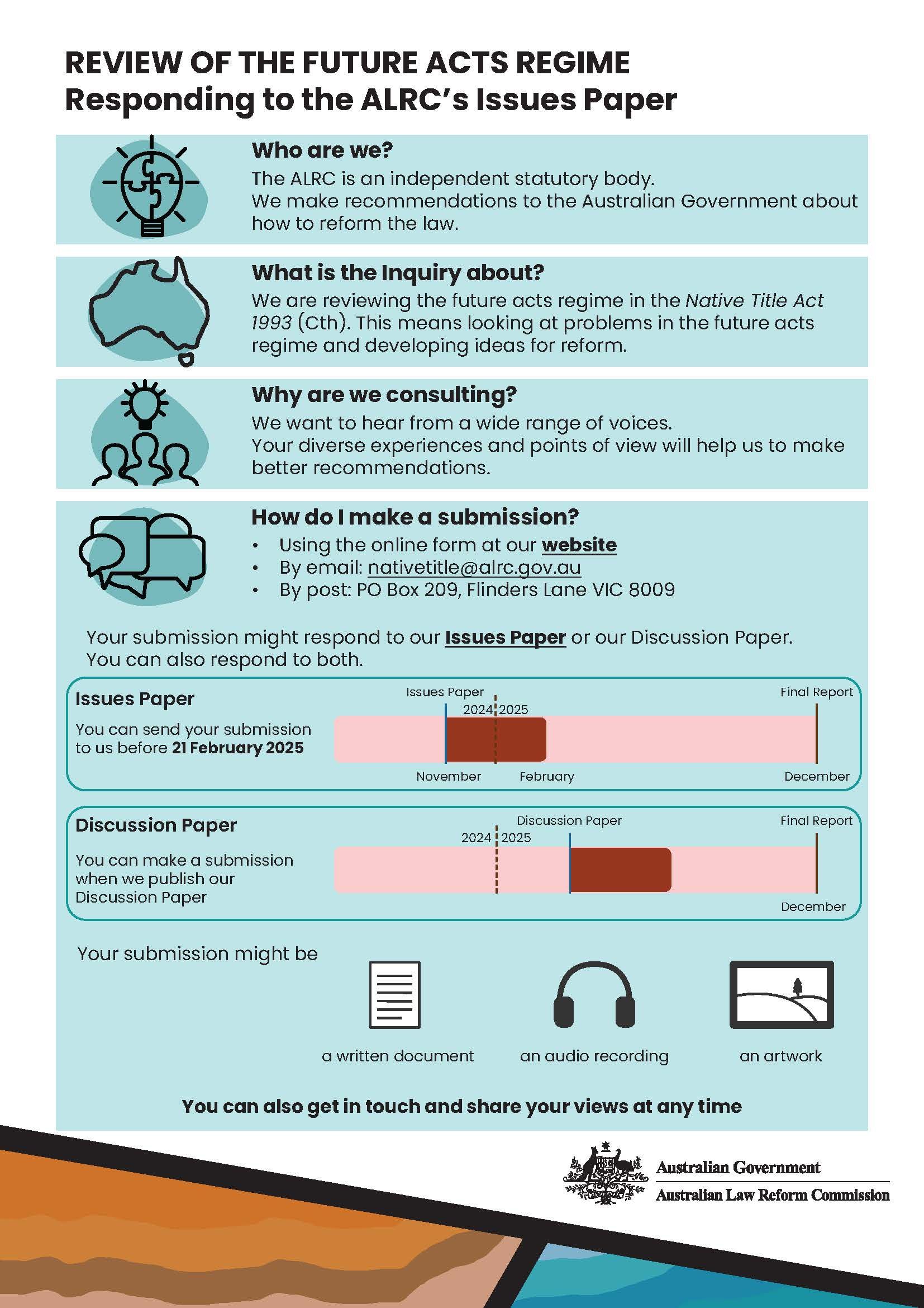 The Issues paper to guide submissions found by visiting the ALC website here.